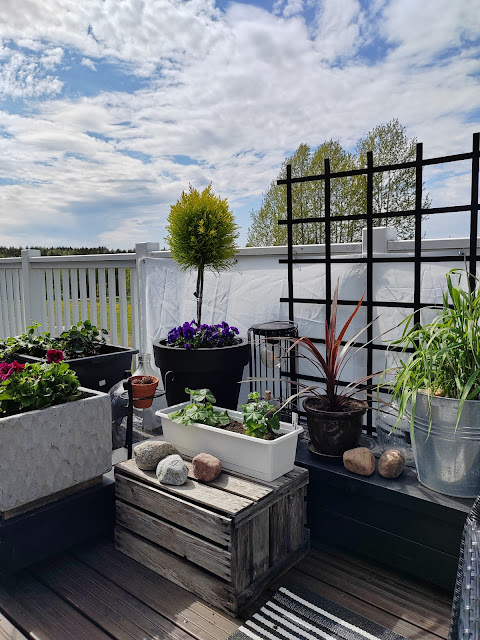 PoistaKyllä on kaunis terassi istutuksineen. Tuolla on mukava viettää aikaa ja katsella kasvien kasvua ja odotella mansikoiden kypsymistä :)